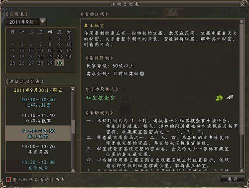 1、首先在活动日历中能够看到“秦王秘宝”活动开启时间为每日11:50~12:50和22:50~23:50。